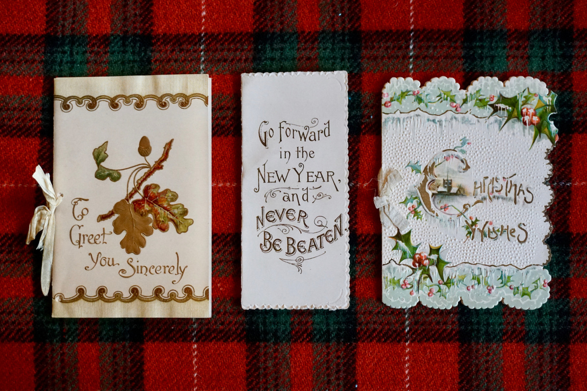 The Christmas cards above are dated between 1908 – 1914, and present a series of happy holiday sentiments. The card on the left features oak leaves and acorns: symbolic of the House of Stuart, and a fitting link to the Crichton-Stuart family. The central card’s uplifting message – ‘Go forward in the New Year and never be beaten’ feels extremely timely and relevant as we approach 2021. The card to the right is a more elaborate embossed design, and displays the intricate Victorian print culture innovation of die-cut paper edges.